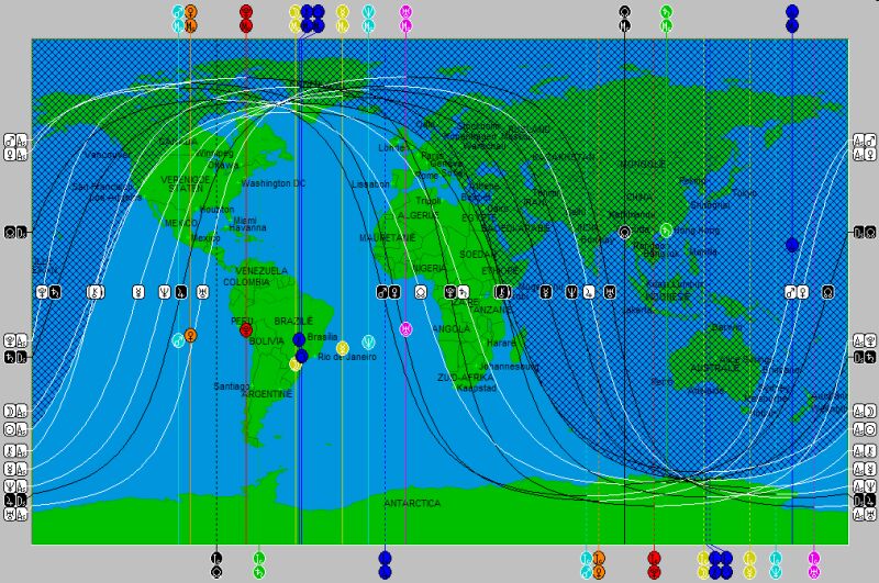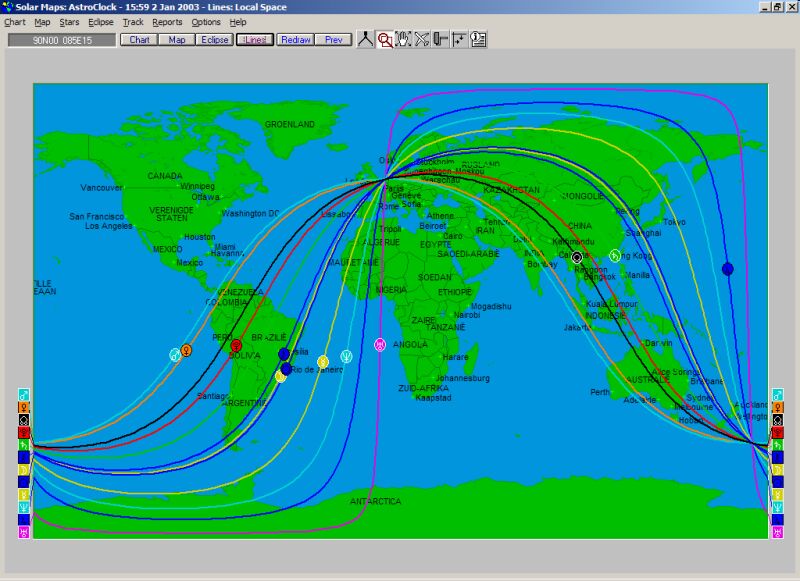 Een wereldkaart met daarop astrocartografische lijnen, die voor willekeurig welke horoscoop berekend kunnen worden, maar ook als actuele klok kan lopen: je ziet dan regelmatig de lijnen verschuiven