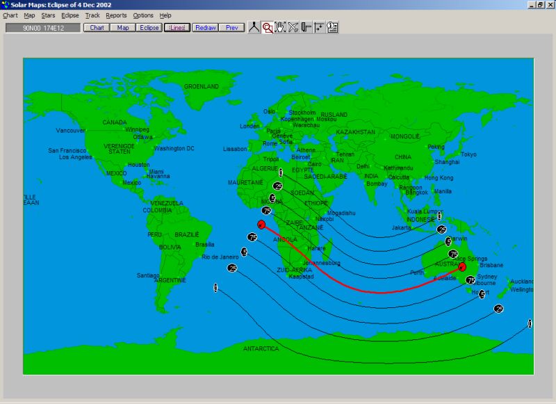 Een geselecteerde eclips ziet er op de kaart zo uit: