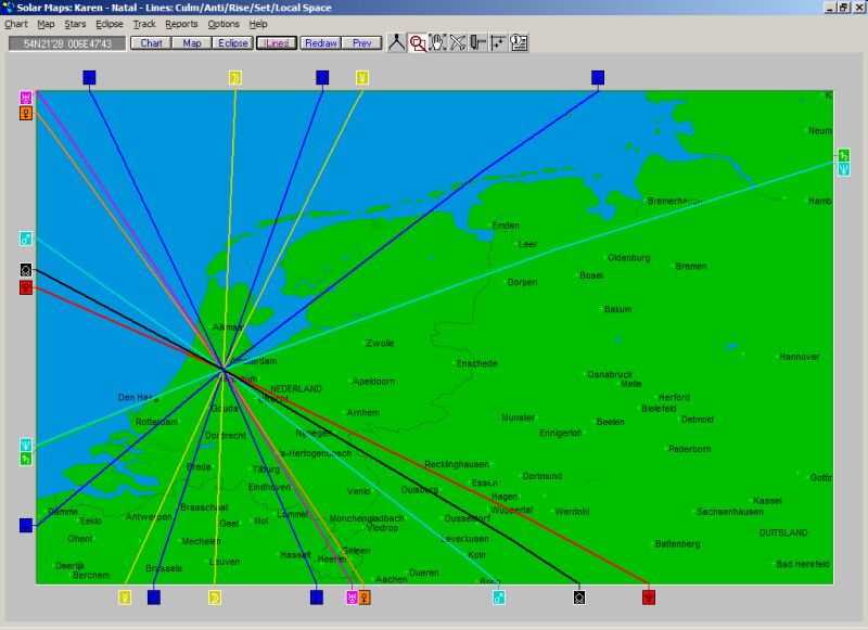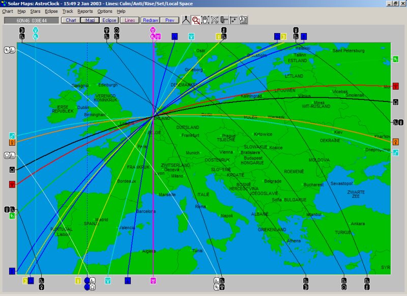 Europa met een combinatie van windroos (lijnen uit een centraal punt, hier Amstelveen) en astrocartografie. Om welke planeetlijnen het gaat zien we in de randen van de kaart: de vierkante hokjes met een planeetsymbool geven de windrooslijnen weer, de astrocartografische lijnen zijn altijd een combinatie van een planeet met een hoekpunt, met de kleurcode zwart voor planeten die dalen, wit voor planeten die rijzen, en loodrechte planeetlijnen in kleur voor planeten op het hoogste (Mc) en diepste (IC) punt:
