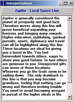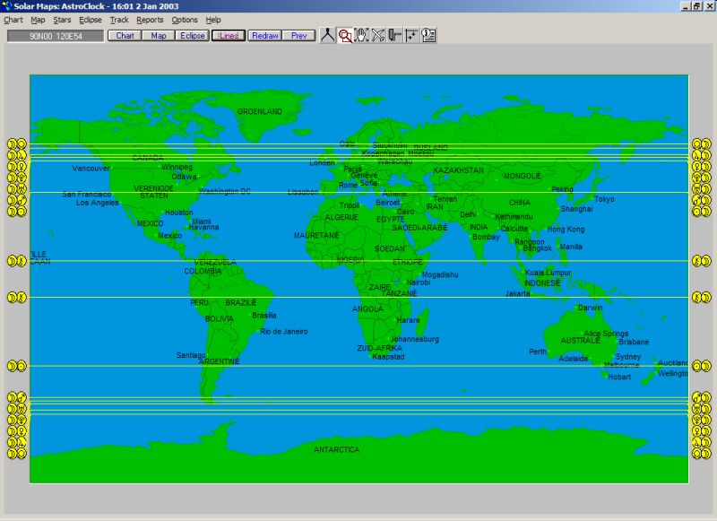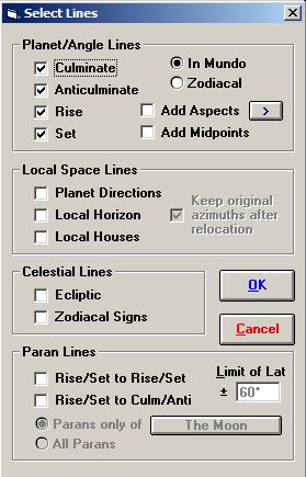 Astro-lijnen: naast de bekende planeet op MC, IC, Asc., Desc. of rijzend en dalend, paranen, planeetrichtingen, windroos, windroos-huizen, lijnen van zichtbaarheid van zon- en maansverduisteringen, etc. zijn er ook aspect-lijnen en midpunt-lijnen. Paraanlijnen kunnen voor meerdere planeten tegelijk worden weergegeven.